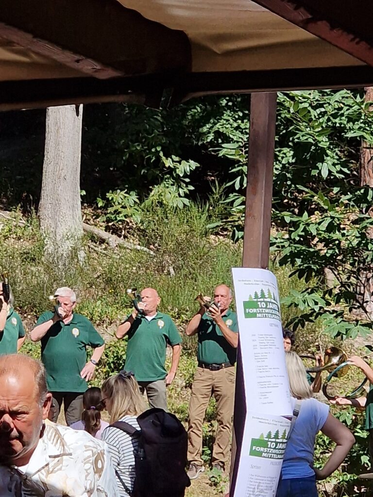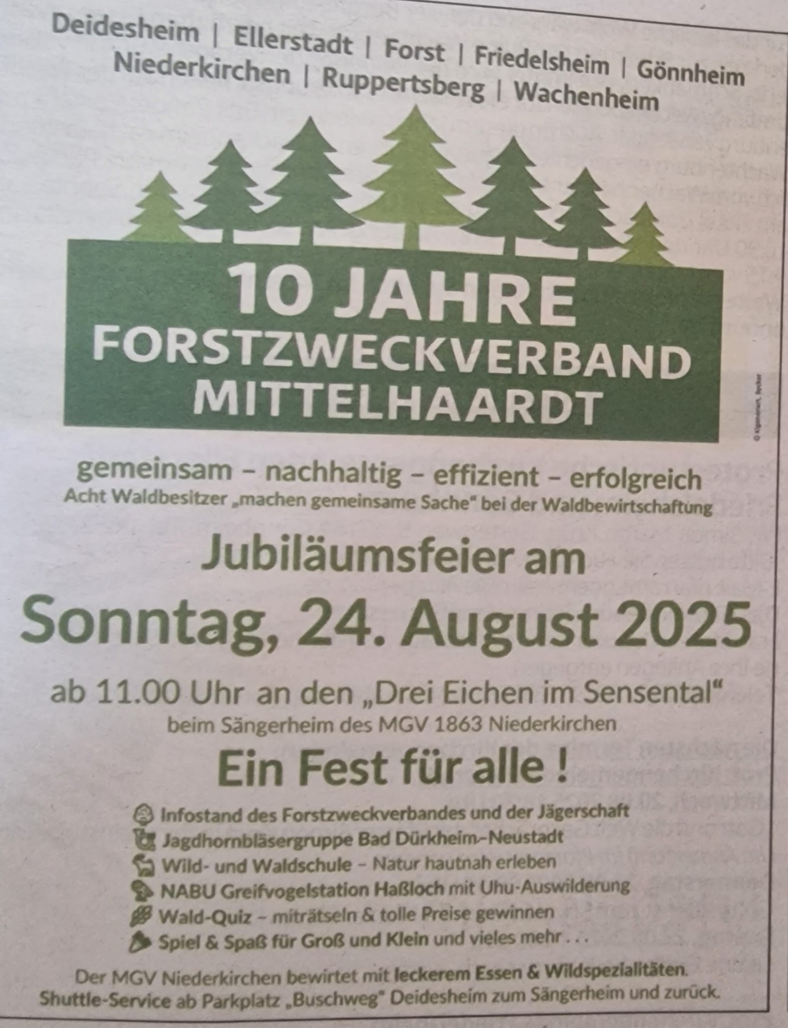 Am 24.08.2025 fand anlässlich des 10-jährigen Bestehens des Forst Zweckverbandes Mittelhaardt nicht nur die Jubiläumsfeier, sondern auch die Verabschiedung des zuständigen Försters R. Kirchner und die Amtseinführung seines Nachfolgers B. Hopp statt. Eine ganz tolle Veranstaltung. Die Deidesheimer und Niederkirchner Waldjäger steuerten die Verpflegung bei. Die Jagdhornbläser umrahmten mit ihren Hörnern die Veranstaltung. Ebenfalls war der Lernort Natur Wagen da und zwei Vögel der Greifvogelstation wurden ausgewildert. Den fast 400 Gästen und Ehrengästen wurde einiges geboten. Wir Jäger haben mal wieder gezeigt, dass Jagd und Wald und eben auch der dazugehörige Förster zusammenarbeiten.