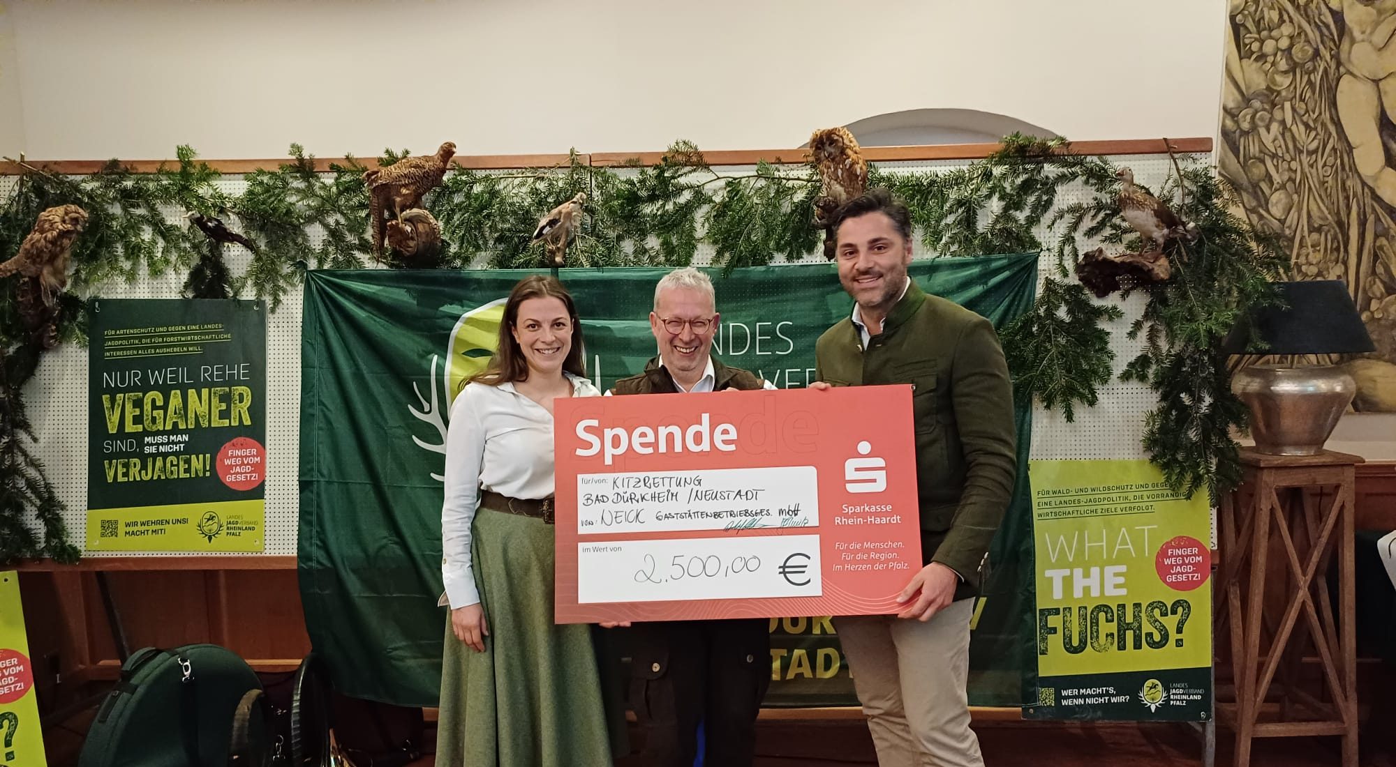 Anlässlich der diesjährigen Jahreshauptversammlungen unserer Kreisgruppe in den Winzerstuben Weick berichtete der Initiator der Jungwildrettung, Knut Bruckbauer, über die abgelaufene Kitzrettungssaison. Um unsere Landwirte, Winzer und Jagdpächter noch gezielter beim „Freifliegen“ der Flächen zu unterstützen, sind wir im Jahr 2026 auf dem Weg, Investitionen von rund 12.000 EUR mit vereinten Kräften zu stemmen. Gerade als er seinen Bericht beenden wollte, überraschen ihn die Gastgeber Laura und Christian Schmitz mit einem Spendenscheck über 2.500 EUR der Weick Gaststättenbetriebs GmbH, die unsere Jungwildrettung unterstützt und mit der wir der Anschaffung einer neuen regenfesten Drohe einen großen Schritt näher gekommen sind.